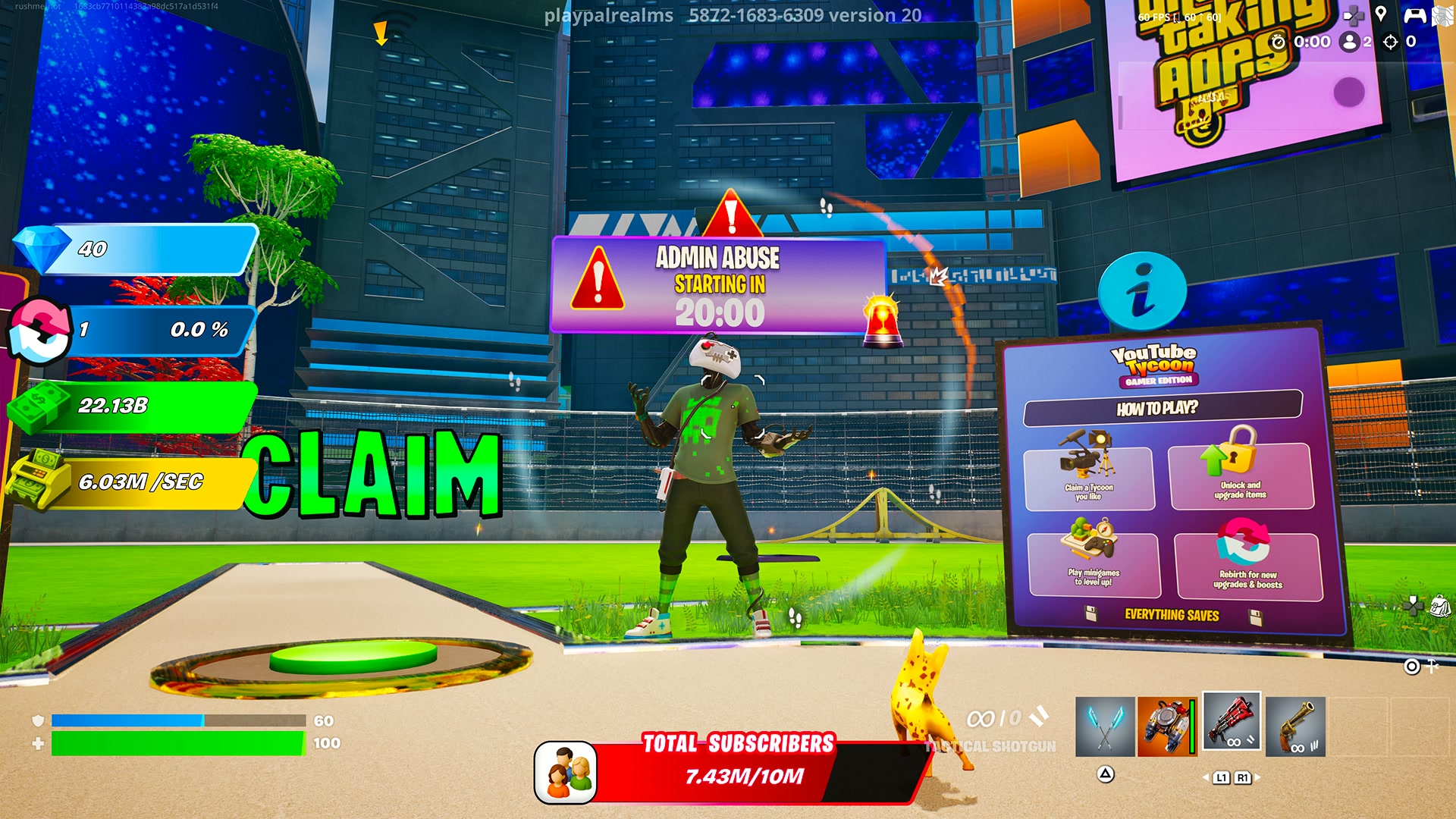 💰 Create Videos & Earn Cash 💰 📈 Grow Your Channel from Zero to Viral 📈 ⭐ Build & Upgrade Your Base ⭐ 🧢 Unlock Exclusive Iconic Video Game Content 🧢 🏎️💨 Drive Custom Cars 🏎️💨 🧟♂️ Zombie and parkour mini-games 🎮